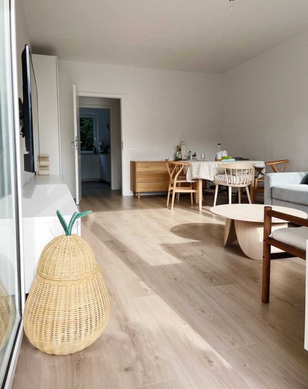 Die Wohnung wird möbliert vermietet (u. a. Schuhschrank, Sideboard, TV-Board, Kleiderschränke, Doppelbett 180×200 cm, Schreibtisch, Regal, Kinderbett 90×200 cm mit Zusatzbett, Lampen). Viele Möbel stammen von Designmarken oder sind maßgefertigt.
