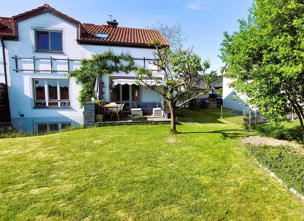Der Garten hat aufgrund der Ortsrandlage einen freien Blick nach Süden und bietet bei schönem Wetter einen Bergblick. Die zugehörige Garage ermöglicht einen direkten Zugang ins Wohnhaus. Die Grundstücksfläche beträgt ca. 490 qm.