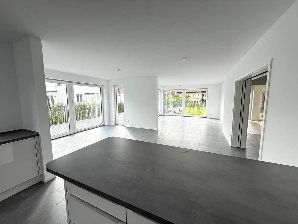 Großzügig offener Schnitt (Barrierefrei) mit großen Fenstern, Terrasse und direktem Gartenzugang. Ausrichtung Ost/Süd/West – Licht pur.