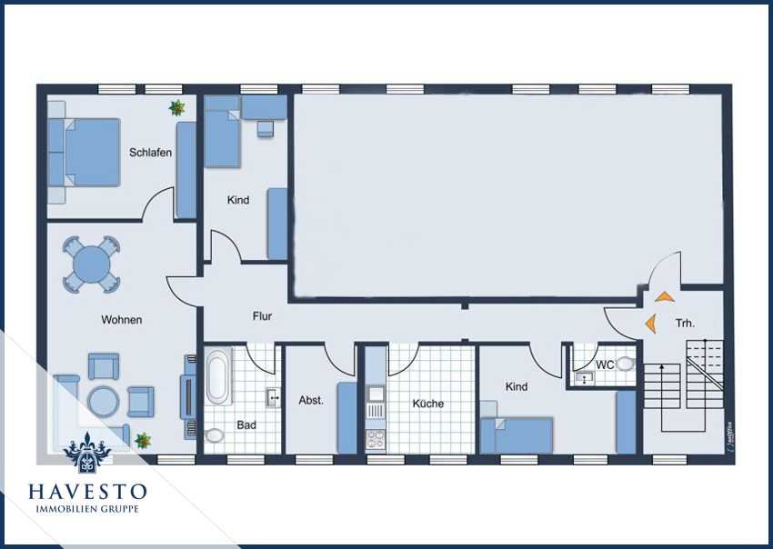 Die Wohnung verteilt sich auf insgesamt 5 Räume mit einem großen Wohnzimmer sowie 4 Schlaf- oder Kinderzimmern. Die Wohnung verfügt zudem über ein separates Gäste WC.