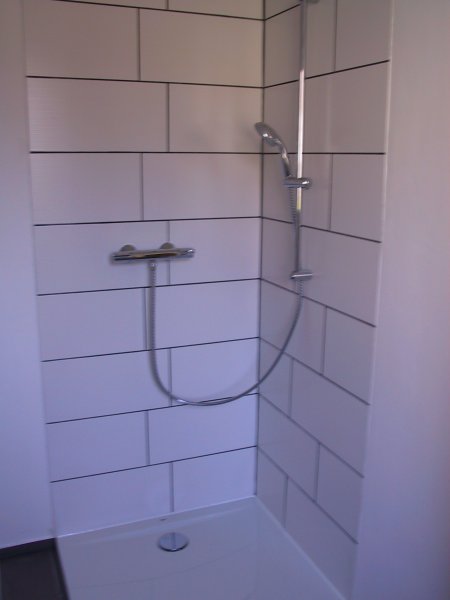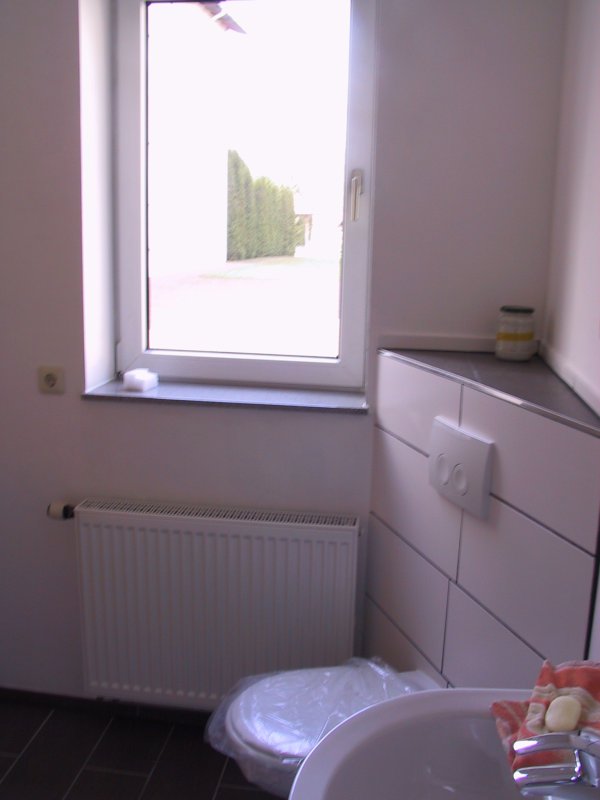 Tageslichtbad mit modernen Fliesen, bodengleicher Dusche mit Glasabtrennung pflegeleichter Steingutboden in Wohnzimmer, Küche und Schlafzimmer