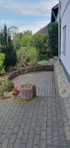 Zum Apartment gehört ein Sitzplatz vor der Wohnung im grünen.