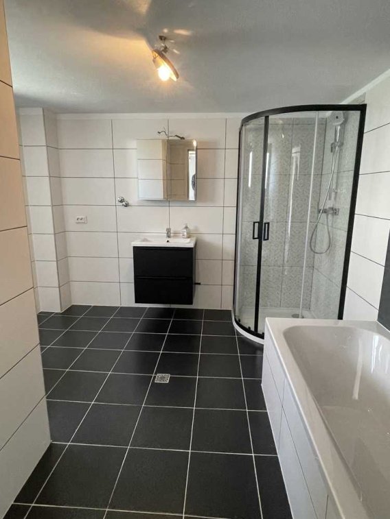 Der Eingang führt direkt ins Erdgeschoss. Hier befindet sich ein großzügiges Tageslichtbad mit moderner Ausstattung, ein separates Gäste-WC sowie ein Abstellraum.