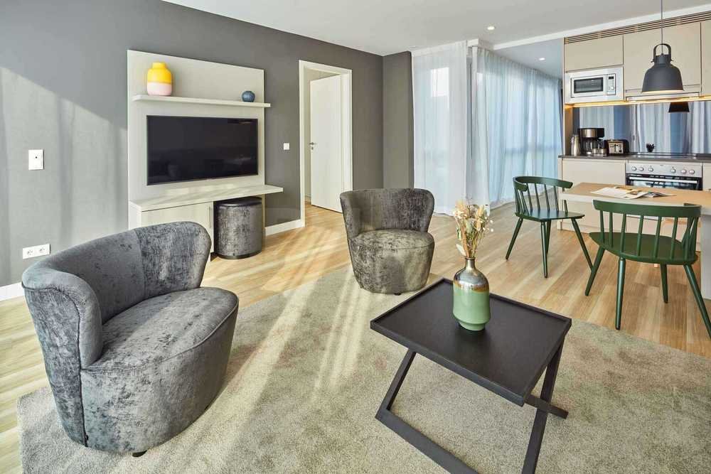 Mit nordischem Minimalismus, klaren Funktionen und exklusiven Materialien besticht unser edler Rückzugsort mit höchstem Wohnkomfort, angepasst an den Lifestyle des Business Travellers. Die klar definierten Wohnzonen bieten Raum für Entspannung und eine angenehme Atmosphäre fürs Homeoffice. Das Schlafzimmer ist mit seinem großen Boxspringbett und dem Einbauschrank der ideale Rückzugsort. Der Wohnbereich bietet genügend Platz für ein gemütliches Sofa, einen Essbereich und einer Einbauküche.