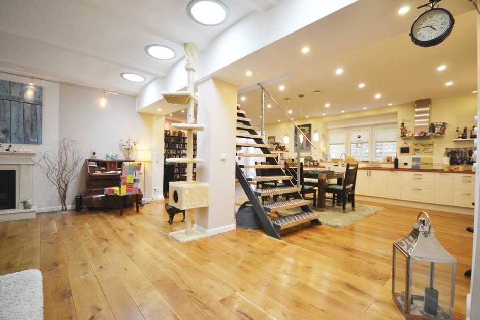 Insgesamt stehen Ihnen vier großzügige Zimmer zur Verfügung, die sich auf zwei Ebenen verteilen. Das Herzstück der Wohnung ist der weitläufige Wohn- und Essbereich mit angrenzender Einbauküche. Von hier aus führt eine Treppe in das obere Geschoss mit dem Hauptschlafzimmer.