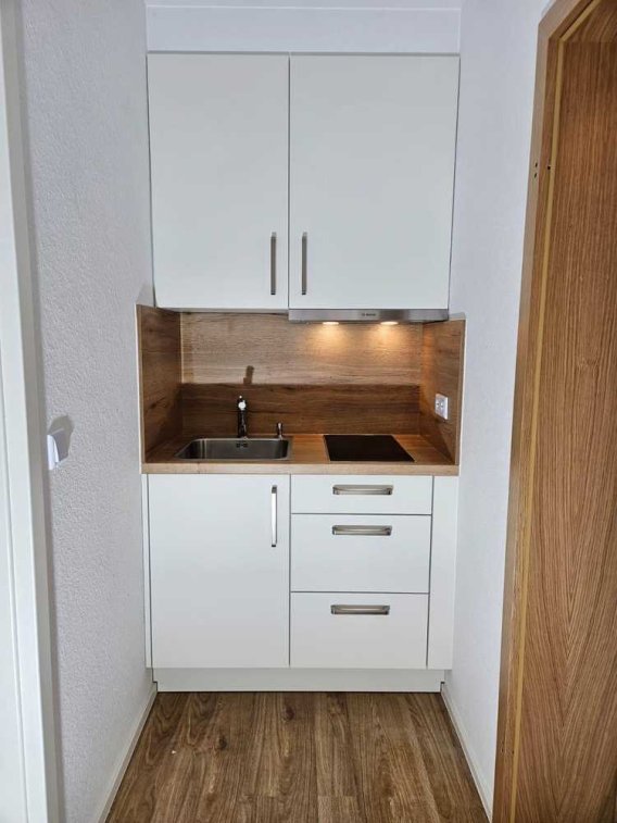 - Offene Küchennische mit moderner, neu eingebauter Einbauküche