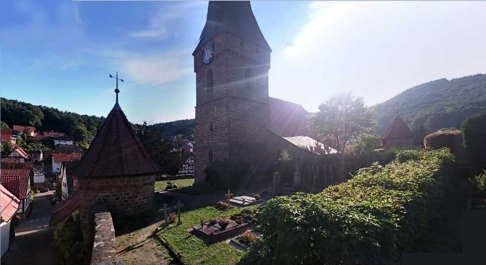 Direkt am Waldrand mit herrlichem Blick über den historischen Dorfkern mit seiner Kirche und ihren Wehrtürmen aus dem 12. Jahrhundert.