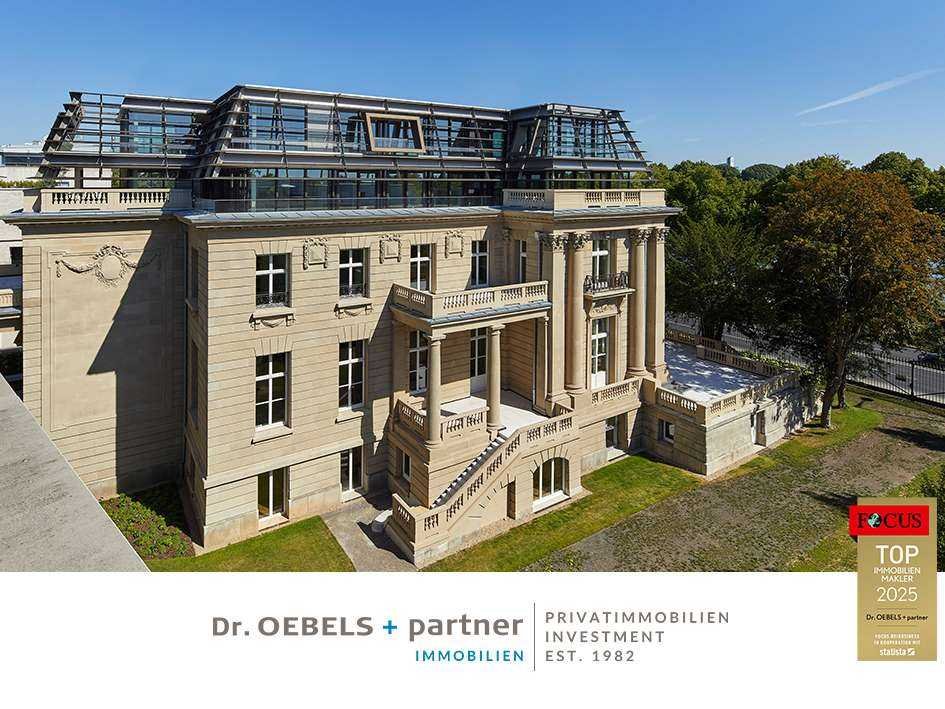 Das Objekt wurde aufwendig saniert und durch einen erweiterten zweigeschossigen Dachaufbau ergänzt. Es entstanden insgesamt zehn luxuriöse Wohnungen unterschiedlicher Größe neben der historischen Beletage mit ca. 880 m², einem schlossähnlichen Foyer mit eigenem Treppenaufgang, einer zentralen Halle sowie saalartigen Repräsentations- und Gesellschaftsräumen. Da sich das Palais mit seiner Prunkfassade am Rheinufer befindet, stellt es einen zentralen Blickfang dar. Nach historischem Vorbild entfaltet sich auf der Rückseite ein Privatpark. Der Park entlang der Grundstücksgrenze, eingerahmt von Gebäuden, wird zusätzlich durch eine Einfriedung geschützt. Unaufdringlich fügt sich ein Kinderspielplatz mit Sandspielfläche und Spielgeräten aus Robinienholz ein. Die elegante Parkanlage zusammen mit dem Palais bilden ein harmonisches, perfekt abgestimmtes Ensemble für höchste Wohnansprüche.