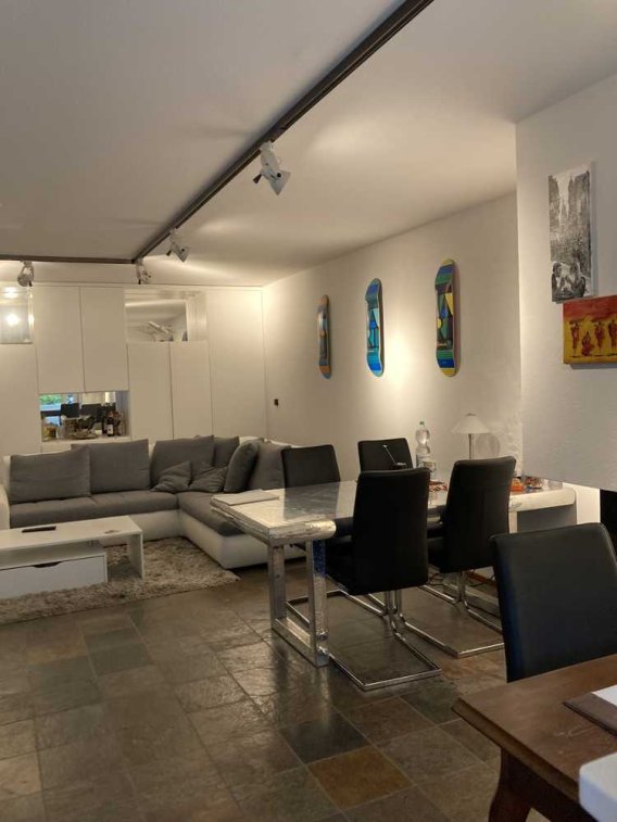 Diese schicke Wohnung befindet sich in einem ruhigen Sieben-Parteien-Haus und bietet einem Single oder einem Paar absolutes Wohlfühlambiente. Durch einen kleinen Flur, der, wie die gesamte Wohnung, mit einem hochwertigen Einbauschrank versehen ist, gelangt man in den großzügigen Wohn-Essbereich mit offenem Kamin und integrierter Küche, von dem die rund 45 qm große Terrasse begehbar ist. Sie wird von einer elektrischen Markise beschattet.