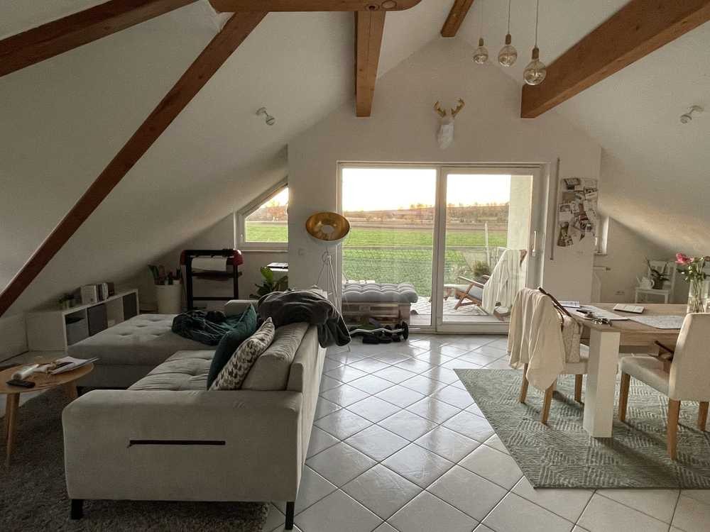 Die Wohnung verfügt über einen großen, sehr hellen Wohn-Essbereich mit Einbauküche. Neben den charmanten Balken im Wohnbereich, ist der Balkon das absolute Highlight der Wohnung. Durch die direkte Feldrandlage hat man einen wunderschönen, unverbauten Ausblick aufs Feld und kann hier abends die Sonnenuntergänge genießen.