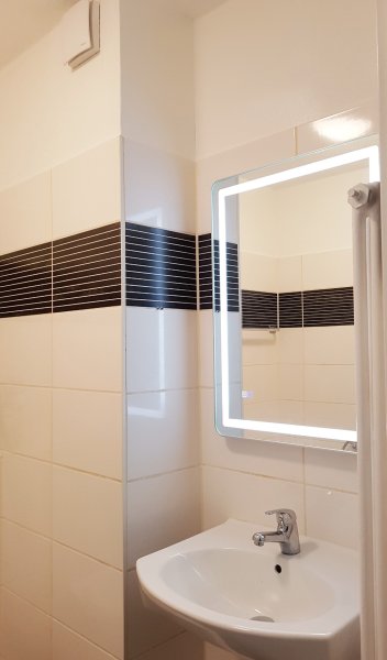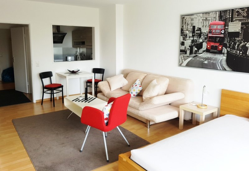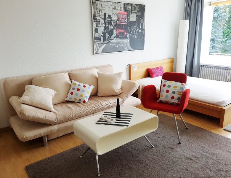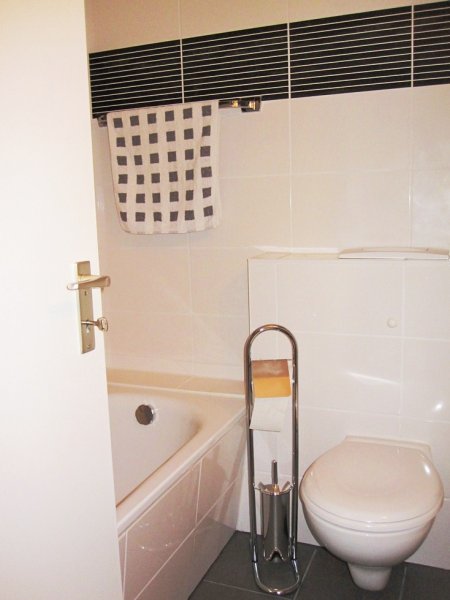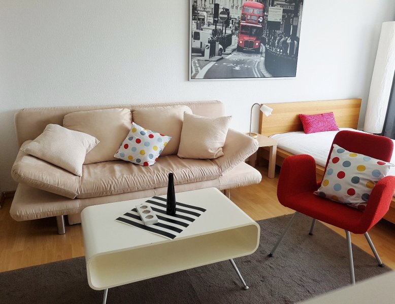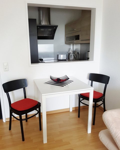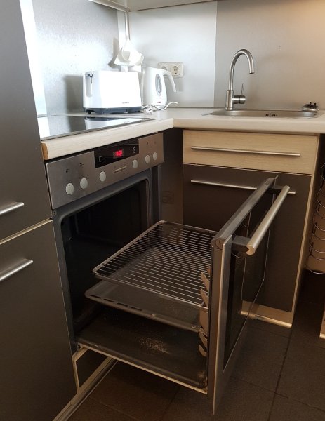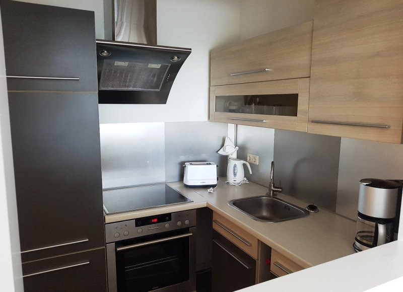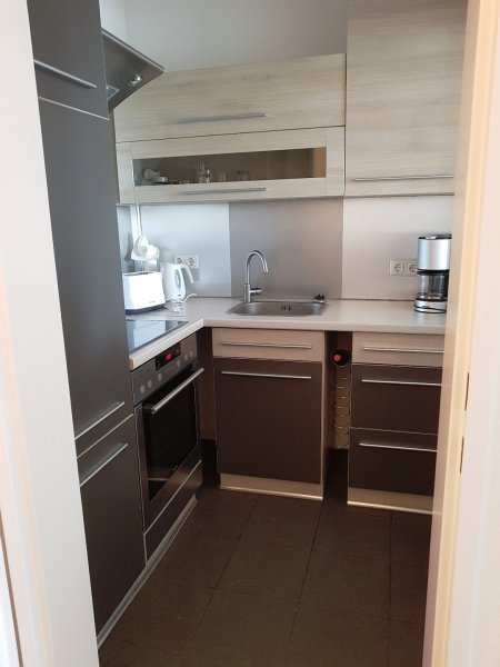 Voll möbliert - moderne Ausstattung, einschließlich Geschirr, Töpfe, Gläser, Besteck, Staubsauger, etc., ein "normales" Bett (Maße 140 x 200 cm), das zusätzlich zu dem Schlafsofa aufgestellt ist. Voll ausgestattete Einbauküche mit neuem Ceran-Feld Einbauherd von Siemens. Die Wohnung ist mit Laminat, und in der Küche und im Bad mit Fliesen, ausgelegt.
