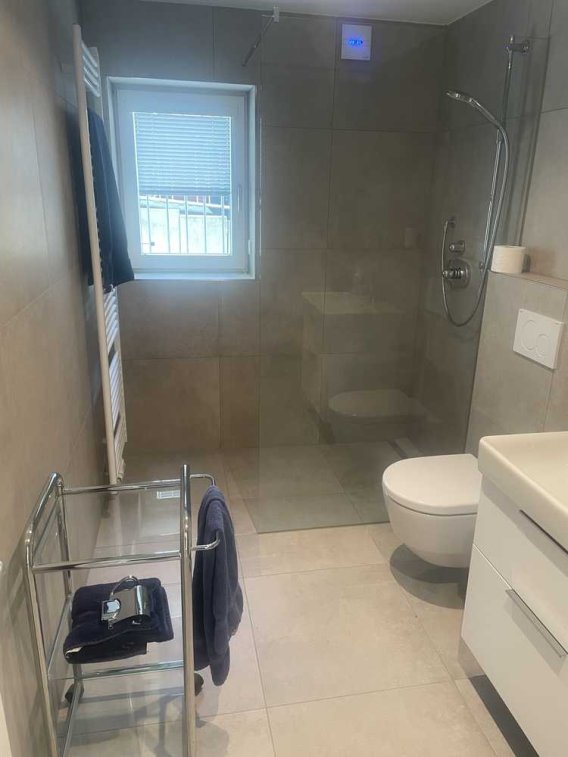 Duschbad mit ebener Dusche u. Glastrennwand, HDT-Heizkörper,