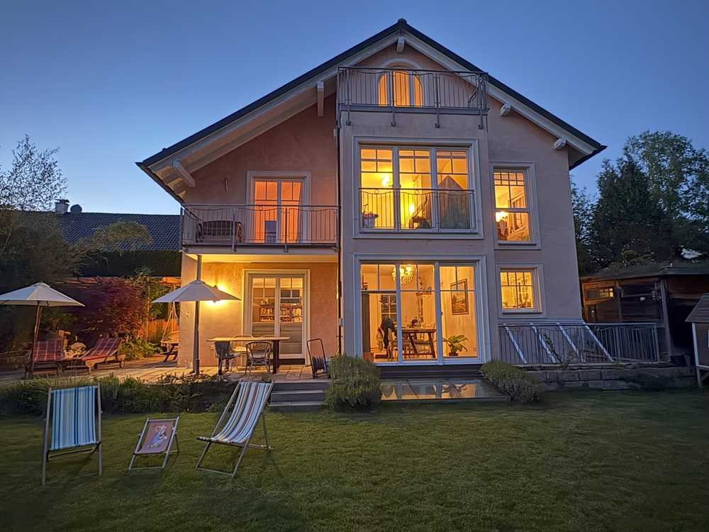 Auf einer Gesamtfläche von ca. 239 m² und einer Grundstücksfläche von 579 m² überzeugt die Villa mit einer lichterfüllten Raumgestaltung mit bodentiefen Fenstern. Das Haus umfasst im Erdgeschoß einen großzügigen Wohn- und Essbereich, eine sehr schöne nostalgisch anmutende Küche der Küchenmanufaktur Oster Küchen, sowie ein Gästebad. Der Boden ist im klassisch eleganten italienischen Naturstein gehalten. Das Obergeschoß besteht aus 3 Zimmern, Elternschlafzimmer und 2 Kinderzimmer oder Arbeitszimmer, sowie einem großzügigen Bad mit eleganter Badewanne, zwei Waschbecken und einem schönen Blick auf den See und die Berge. Der Boden ist in dunkelbraunem Parkett gehalten, welches letztes Jahr abgeschliffen und eingeölt wurde. Zu dem Elternschlafzimmer gehört ein durch eine Schiebetür getrennter großzügiger begehbarer Kleiderschrank.