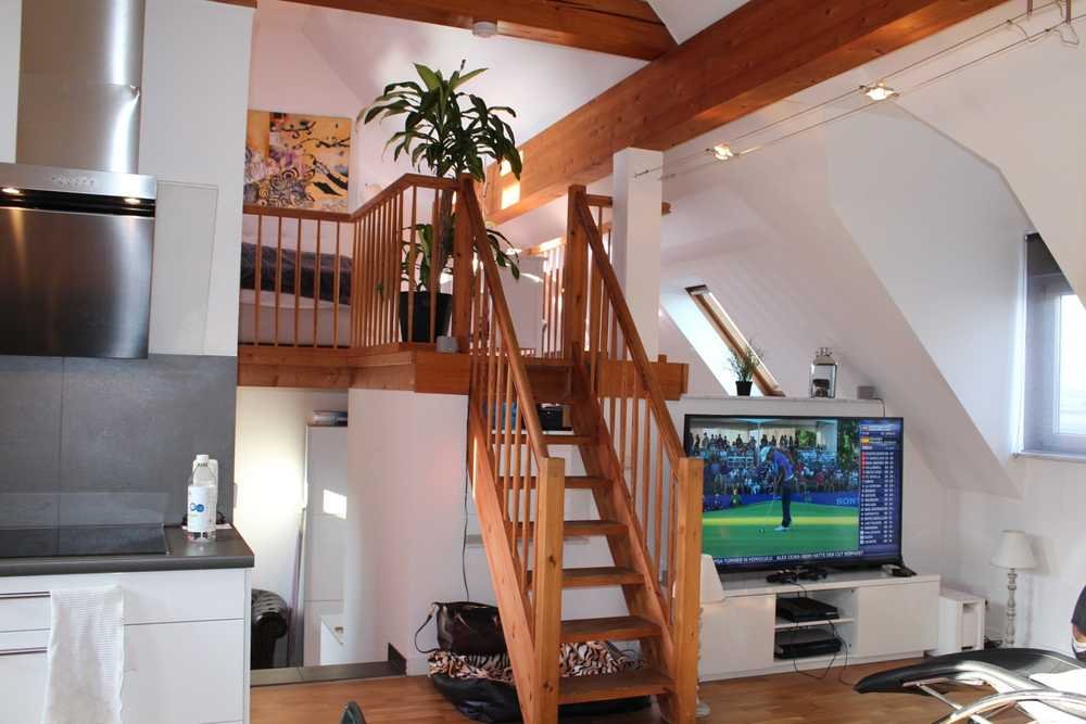 Eine Maisonette Wohnung mit besonderem Charm! Ein eigener Eingang und Keller verleiht dieser 80qm Wohnungen auf 3 Level einen Haus in Haus Charakter. Im eigenen Flur direkt neben der Garage geht es über eine Treppe hoch in die Wohnung und auf das erste Level. Über nur 5 Stufen erreicht man das Wohn- / Esszimmer, Küche und Badezimmer. Das Schlafzimmer befindet sich auf einem Holzpodest in einer Dachschräge, welches über eine massive Holztreppe zu erreichen ist. Diese besondere Wohnung ist eine Rarität und muss einfach live erlebet werden.