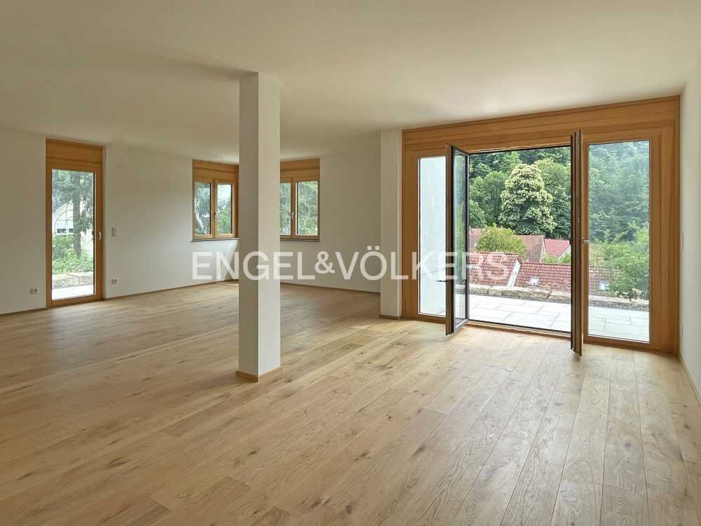 Moderne Neubau-Wohnung mit ausgewählter und exklusiver Ausstattung: vom Echtholz-Eichenparkettfußboden über dreifachverglaste Holzrahmen-Fenster mit Aluminiumverblendung für maximale Wärmedämmung und erhöhten Sicherheitsstandard bis hin zu Granitfußböden im Treppenhaus und im Keller und zusätzlichen Solarmodulen auf dem Dach zur Unterstützung der Brauchwassererwärmung. Wunderschön im Grünen gelegen befindet sich diese Wohnung in Alt-Handschuhsheim in erhöhter Lage. Sie befindet sich im Erdgeschoss eines 2023 fertiggestellten Neubaus und verfügt über einen geräumigen und lichtdurchfluteten Wohn-Essbereich, eine separate Küche mit einer modernen Einbauküche inklusive aller Elektrogeräte, zwei moderne Bäder, eines davon mit Tageslicht und Anschlüssen für Waschmaschine und Trockner, sowie ein Schlafzimmer und zwei Arbeits-/bzw. Gästezimmer. Zum größeren, nach Süden gerichteten Teil der Terrasse führt eine zweiflügelige Tür aus dem Wohn-Essbereich. Der östliche Teil der Terrasse mit angrenzendem, kleinen Gartenanteil ist durch eine separate Tür erreichbar. Im Haus befindet sich eine Gasheizung, die Räumlichkeiten werden über eine Fußbodenheizung beheizt. Ein kleiner, zur Wohnung gehöriger Kellerraum bietet zusätzlichen Stauraum. Ein PKW-Stellplatz in der Mühltalstraße steht den Mietern zur Verfügung. Das Haus ist nicht barrierefrei zu erreichen; man gelangt von unten über die Mühltalstraße über mehrere Treppen nach oben oder oberhalb über den Bahofweg treppabwärts zum Eingang des Hauses. Aufgrund der Hanglage und der offen gestalteten Terrassen ist das Haus nicht für Familien mit kleinen Kindern geeignet.