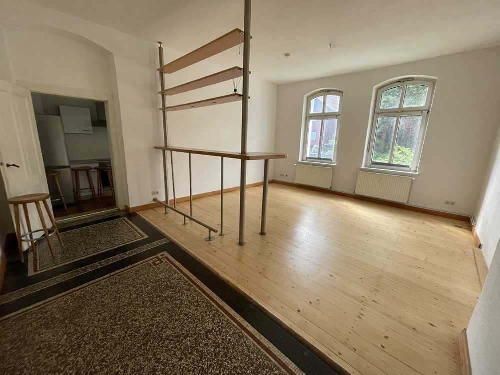 Diese Wohnung verfügt über ein großes Wohnzimmer mit eingebauter Theke, das bei einem Bezug als WG gut als Gemeinschaftsraum genutzt werden kann, zwei weitere Zimmer, eine Küche mit neuer Einbauküche, ein Duschbad und eine Diele mit Gartenausgang sowie über eine Wohnfläche von ca. 75 m². Die Holzdielen wurden 2022 durch einen Fachbetrieb renoviert.