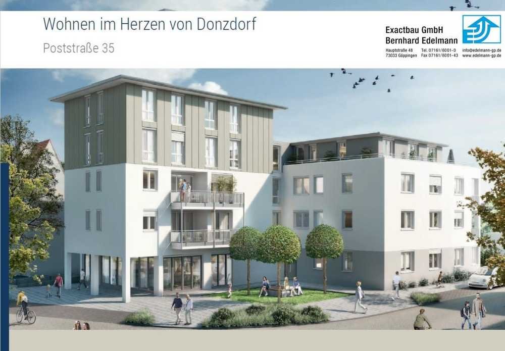 In zentraler Lage von Donzdorf entstehen Neubau-Eigentumswohnungen vom 1. Obergeschoss bis zum Dachgeschoss, sowie Gewerbeflächen im Erdgeschoss in einem Wohn- und Geschäftshaus. Das Bauvorhaben erfüllt die Bedingungen altersfreundlichen Bauens, d. h. unter anderem, dass jede Wohnung vom Untergeschoss/Tiefgarage bis ins Dachgeschoss über den Aufzug erreicht werden kann. Außerdem ist ein Hausmeisterservice vorhanden, der die Treppenhausreinigung übernimmt. In der gesamten Wohnung ist eine Fußbodenheizung vorhanden. Geheizt wird über eine Luft-Wasser-Wärmepumpe mit Gas-Spitzenlastkessel. Zudem wird auf dem Dach eine Photovoltaikanlage zur Stromgewinnung installiert.