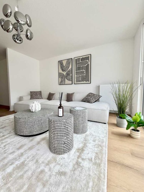 Über eine einladende Diele erreichbar, befindet sich im Erdgeschoss ein großzügig gestaltetes und lichtdurchflutetes Wohn- und Esszimmer sowie ein separates Gäste-WC am Eingangsbereich. Mehrere große, teils bodentiefe Fenster, ein Designbodenbelag in einer modernen Holzoptik sowie ein offener Küchenbereich machen den Wohn- und Essbereich zum wundervollen Herzstück des Mietobjekts.