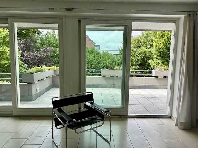 Der große, sonnige Westbalkon ist vom Wohnzimmer aus zugänglich und hat eine Markise. Über eine Wendeltreppe gelangen Sie vom Balkon in Ihren Gartenanteil. Durch die Lage im Obergeschoss sind Wohnung und Balkon fast uneinsehbar, was für Privatsphäre sorgt.
