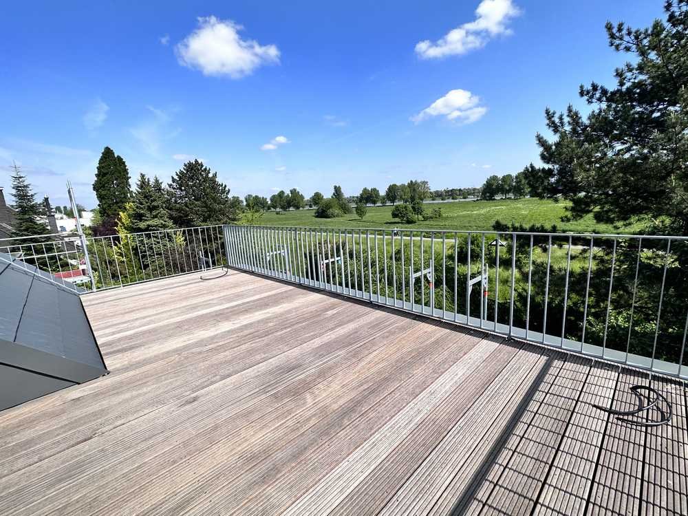 Durch eine eigene Eingangstür gelangt man über eine Treppe in das 1. Oberge-schoß des Hauses, wo sich der offene Wohn-Ess-Küchenbereich sowie ein Gäste-WC befinden. Die Wohnung verfügt über eine moderne Einbauküche mit Miele- und Liebherr-Elektrogeräten. Eine schwebende Loft-Stahltreppe führt ins 2. Ober-geschoß mit Arbeits- und Schlafbereich sowie einer angeschlossenen Dach-terrasse mit direktem Blick auf die Rheinauen und den Rhein. Insgesamt führen die vielen großen Fenster zu einer sehr guten Lichtdurchflutung und bieten eine traumhafte Sicht ins Grüne.