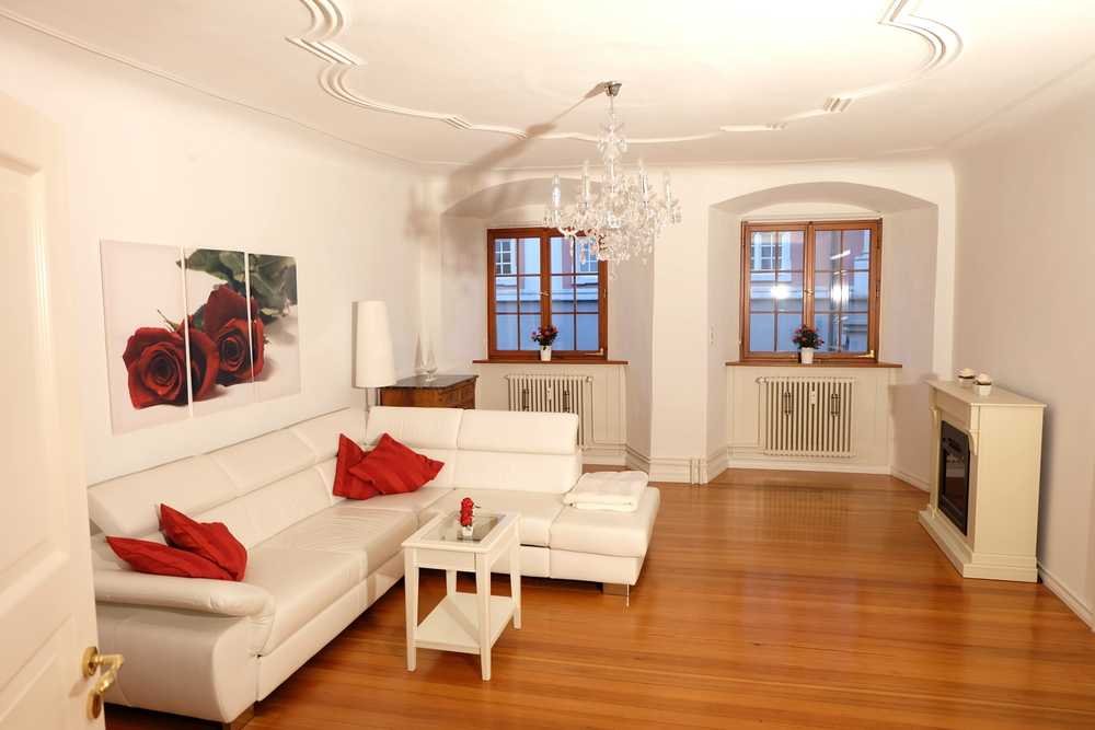 Im Jahr 2012 wurde diese Wohnung komplett renoviert, 2017 erhielt sie eine noch modernere Küche. Sie bietet u.a. ein Wellnessbad mit Infrarot-Sauna, ein helles Schlafzimmer mit weißem Himmelbett in Übergröße (L 220 x B 200 cm), ein großes, elegantes Wohnzimmer (30 qm) mit Stuckdecke, großer weißer Ledercouch, Full-HD-TV (49 Zoll/123 cm) und elektrischem Kaminofen für gemütliche Winterstunden.