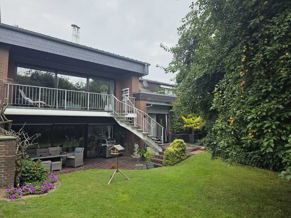 Das Wohnzimmer I des OG hat einen offenen Kamin und ein 3-fach verglastes Schiebelement über die gesamte Südfront mit Blick in den Garten. Daran schließt sich ein überdachter Balkon an, der über eine Außentreppe mit dem Garten und der Terrasse verbunden ist. Das im EG liegende Wohnzimmer II mit Kaminanschluss (Büro) grenzt ebenerdig an eine großzügige teils überdachte Terrasse zum Garten und bietet ebenfalls ein komplett verglastes, weitläufiges Schiebeelement. Jede Etage bietet ein eigenes vollausgestattetes Bad. Das Haus bietet den Luxus der Nutzung von 2 voll ausgestatteten und neuwertigen Küchen. Die Küche im OG ist zeitgemäß hell gefliest. Die Küche im Untergeschoss wird ebenfalls jeden Ansprüchen gerecht und komplettiert die Etage mit dem neu renovierten Bad zu einem eigenständigen Wohnbereich.
