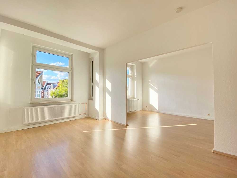 Schon beim Eintreten empfängt dich der großzügige Flur mit klassischem Altbau-Flair und einem stilvollen Boden in Dielen-Holzoptik.