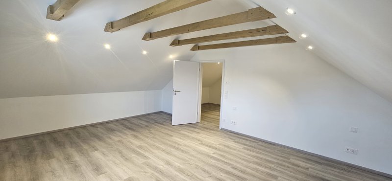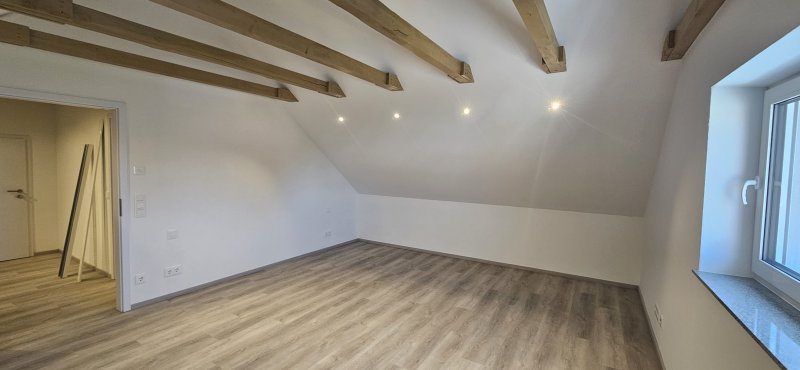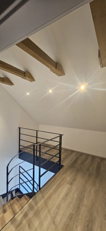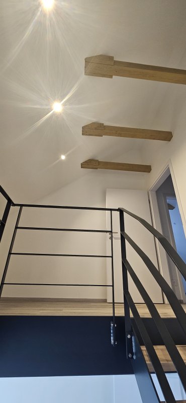 -integrierte Deckenspots in Flur und Dachstudio mit offenen Balken