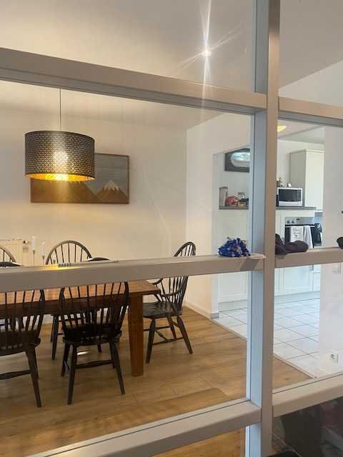 Man betritt das Haus und befindet sich in einer geräumigen Diele. Die Küche bietet reichlich Platz zum gemütlichen Verweilen. Der halboffene Essbereich weitet sich zum gemütlichen Wohnbereich aus, von dem man an mehreren Möglichkeiten zum Austritt in den Garten hat.
