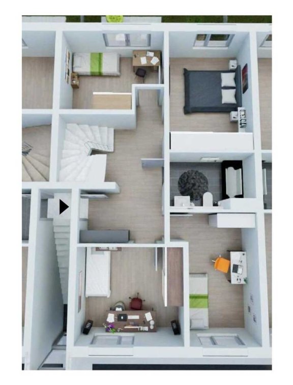Die Schlafräume befinden sich im 1. Obergeschoss, der Wohnbereich liegt im 2. Obergeschoss und hat direkten Zugang zur großen Dachterrasse – ideal zum Entspannen oder für gesellige Stunden im Freien.