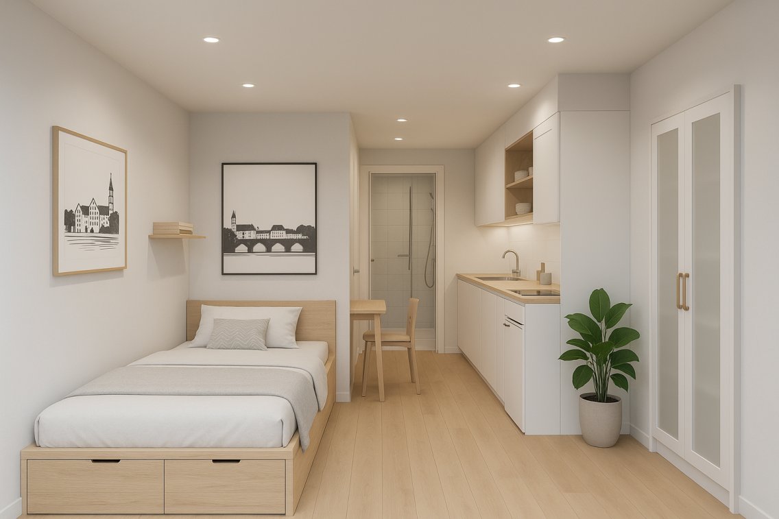 Die foxy studios sind wohnfreundlich und stilvoll eingerichtet mit Garderobe, Wohn/Ess-, Arbeits-, Schlafbereich, Ankleide, Badezimmer und smarten Stauräumen. Zu jedem Studio gehört ein eigener Parkplatz.