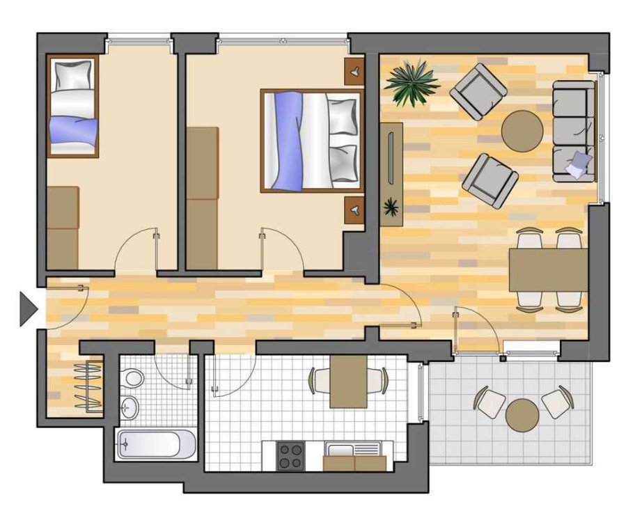 Sie teilt sich auf in zwei Schlafzimmer, ein helles Wohn- Esszimmer mit Balkon, die Küche und das innenliegende Wannenbad. Im Flur ist weiterhin eine kleine Nische als Garderoben-Ecke vorgesehen.