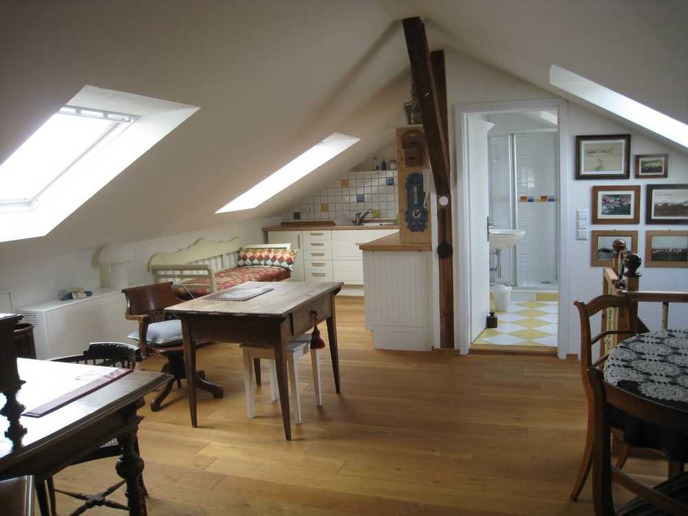 Dachgeschoß einer 3-Familien-Villa in einer ruhigen Anliegerstrasse. 5 Minuten zum Marktplatz, 2 Min. zur nächsten Bushaltestelle, 8 Minuten zum Bahnhof. Blick auf die Dächer von Lahr und zum Geroldseck. Kein Aufzug, ca. 56 Stufen! davon sind 46 Stufen im allgemeinenTreppenhaus gemütlich zu schreiten. Die letzten 10 Stufen zum "Himalaya" sind sehr steil (ehemals Speichertreppen) Gartenmitbenutzung.