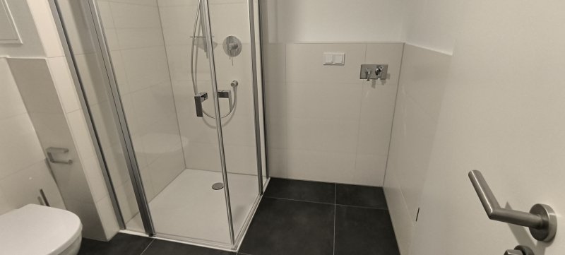 • Großes Badezimmer mit bodengleicher Dusche und Anschluss für Waschmaschine