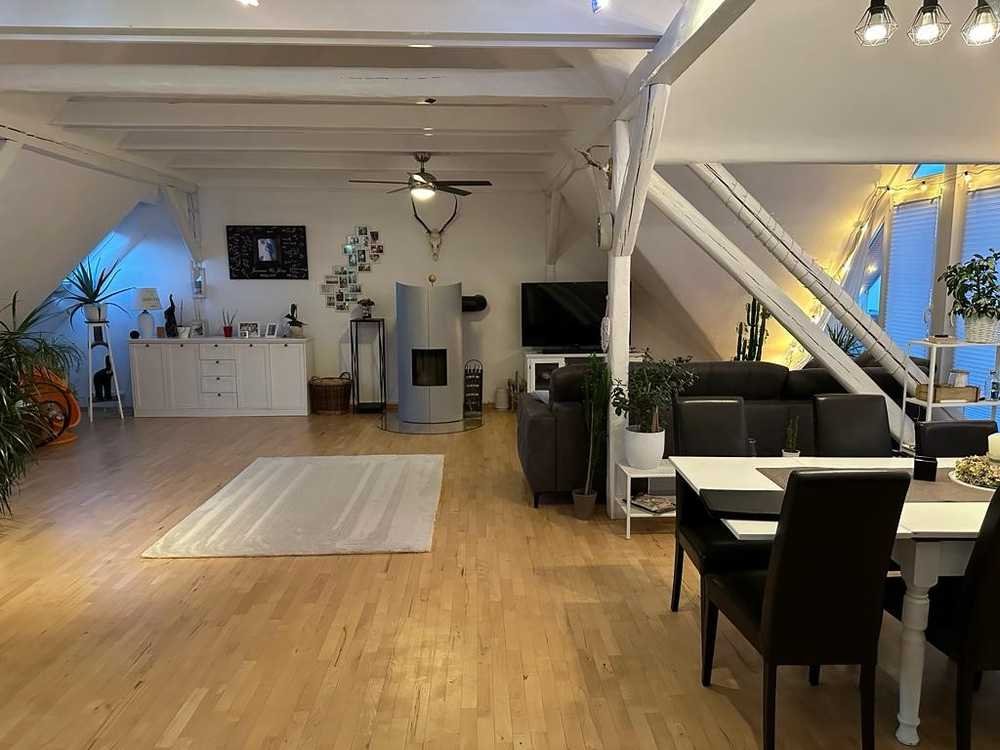 Sie besticht vor allem durch den 67 m² großen Ess- und Wohnbereich und dessen lichtdurchfluteten Räume. Ein absolutes Highlight der Wohnung ist der Kaminofen, mit welchem man in kalten Wintertagen, eine gemütliche und warme Atmosphäre schafft. Dies wird durch die weißen Holzbalken nochmals unterstützt. Das Loft verfügt über große und offene Räumlichkeiten, welches ihr einen individuellen Glanz verleiht.