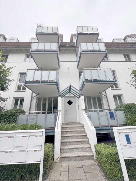 Diese helle Maisonette-Wohnung befindet sich in der Friedhofstraße, sie liegt im 4. Obergeschoss des Hauses und kann bequem mit dem Aufzug erreicht werden. Sie verfügt über ca. 106 m² Wohnfläche, die sich auf vier Zimmer, eine Küche, einen Flur, einen Abstellraum, ein Badzimmer, ein separates Gäste-WC sowie zwei Balkone verteilen.