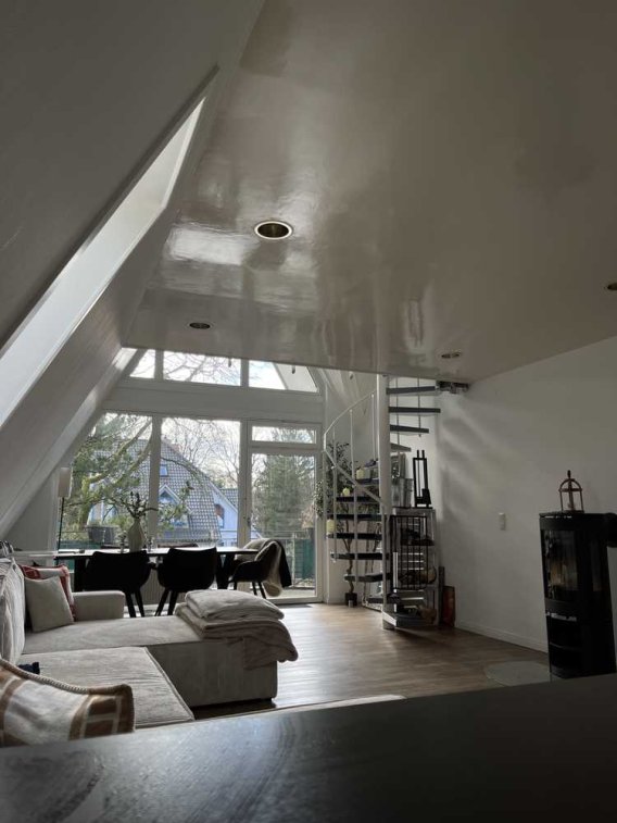 Die Miete würde ca. 2150€ warm kosten und man hat 4 Zimmer auf 125qm2 im Dachgeschoss über 2 Etagen mit einer Treppe (Masionette) und einem Traumhaften Gemeinschaftsgarten.