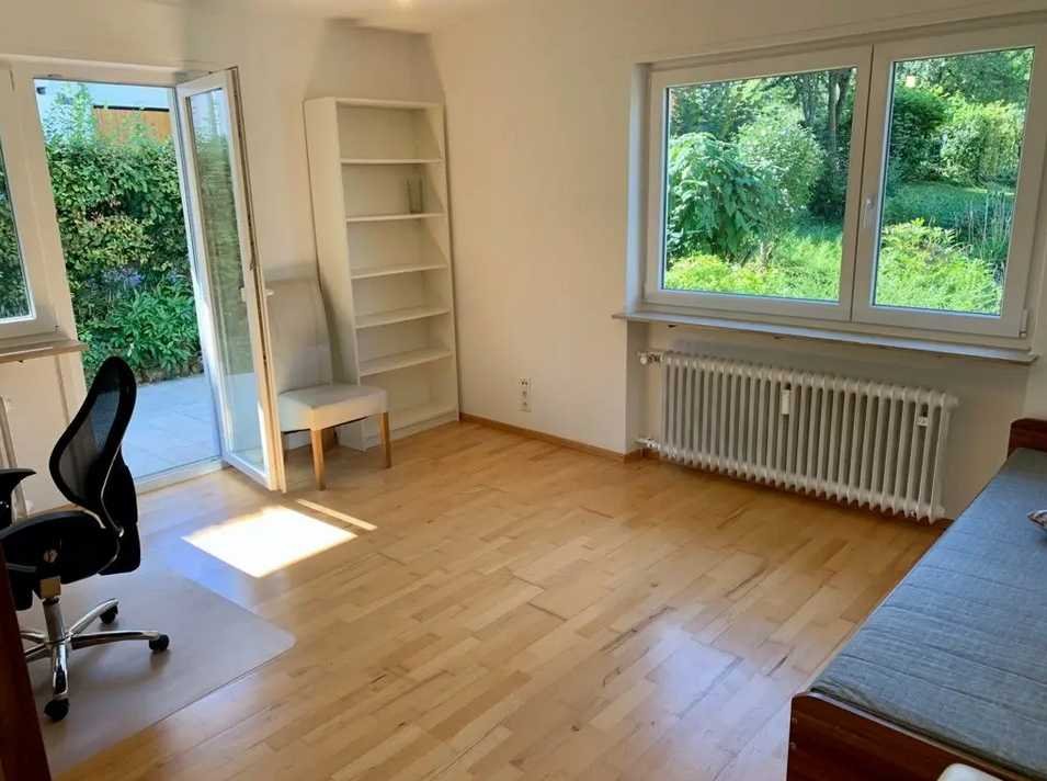 Wohnzimmer: Lichtdurchflutet, mit großem Fenster und direktem Zugang zur Terrasse und in den Garten. Ausgestattet mit Schreibtisch, Stuhl, Regal sowie Kleiderschrank.