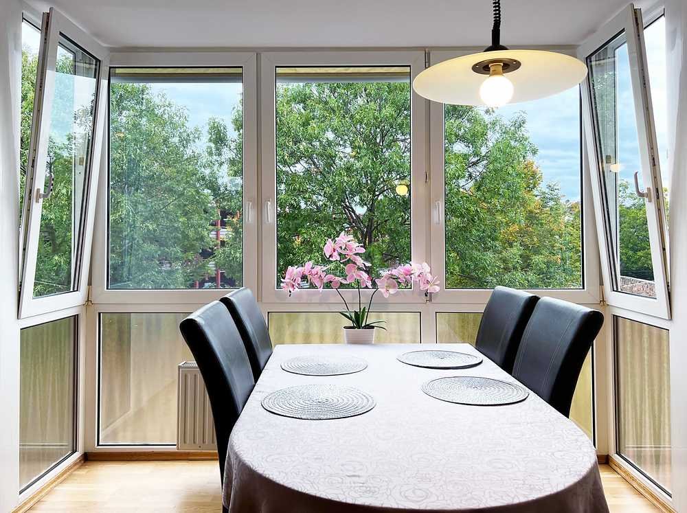 + Eine Küche, die mehr ist als Funktion: gepflegte Einbauküche, dazu ein Essplatz im Erker mit Blick ins Grüne – hier schmeckt sogar das schnelle Frühstück nach Dolce Vita.