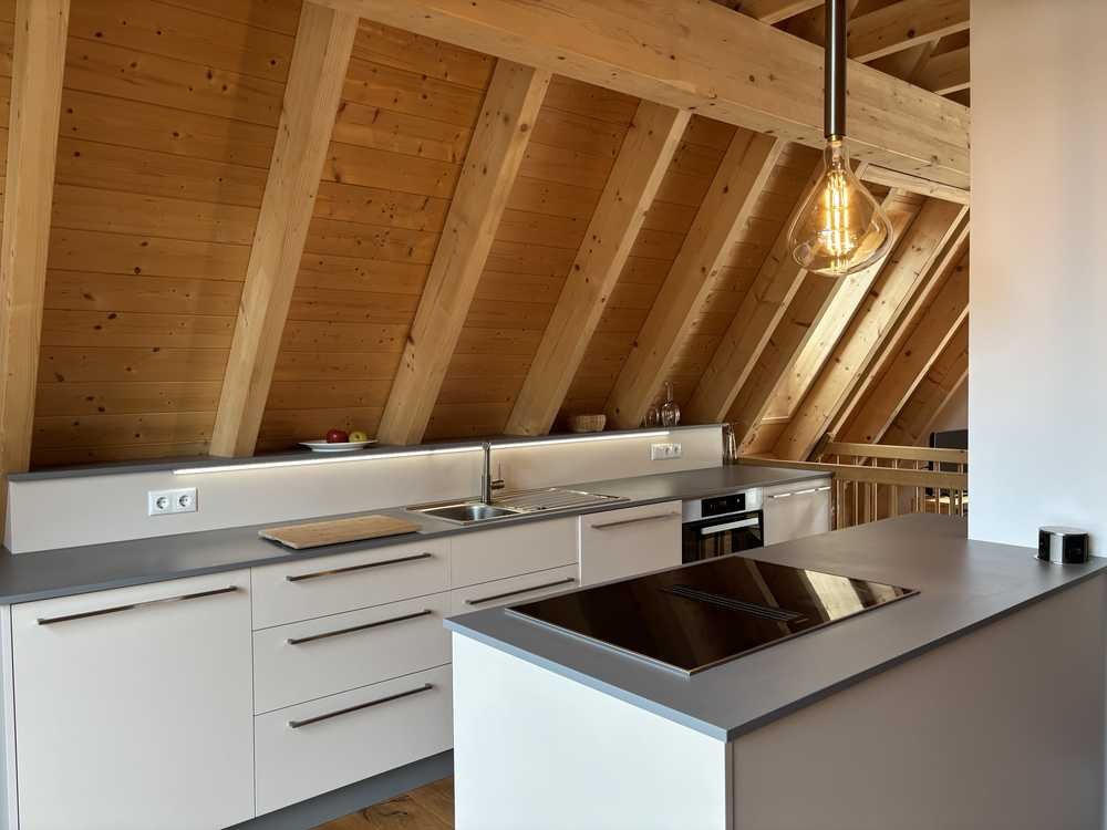 Im Erdgeschoss befinden sich zwei schön geschnittene Schlaf-/Arbeitszimmer sowie ein Duschbad. Ein geräumiger Flur mit Einbauschränken (inkl. Waschmaschinenanschluss) bietet zusätzlichen Platz. Im ersten Obergeschoss gelangen Sie in den offenen Wohn-Essbereich von dem aus der große Südbalkon und - durch die Hanglage - eine Terrasse auf der Hinterseite des Hauses zugänglich sind. Der schöne Sichtdachstuhl schafft eine besondere, luftige Wohnatmosphäre. Eine moderne Einbauküche mit Kochinsel sowie ein Holzofen sind vorhanden und vom Vermieter abzulösen.