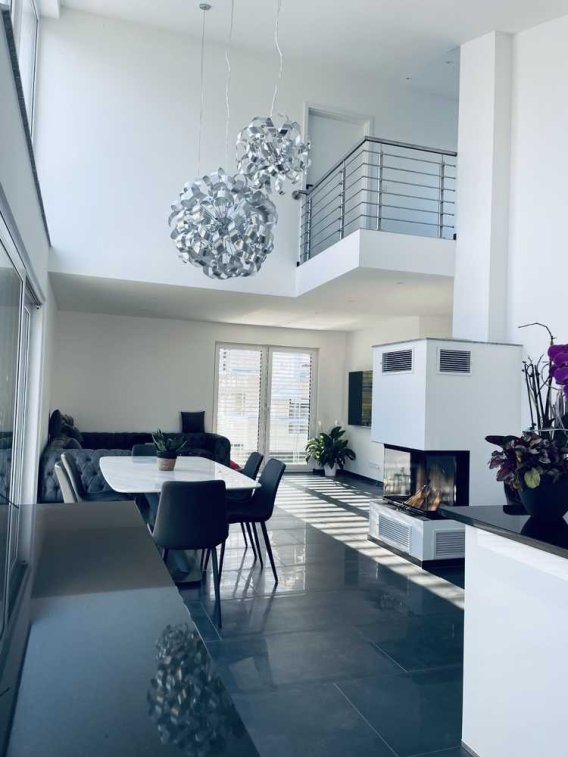 Ein besonderes Highlight ist die hochwertige Design-Küche mit Kochinsel und edler Granit-Arbeitsplatte, die keine Wünsche offenlässt. Für gemütliche Abende sorgt der stilvolle Panoramakamin im Wohnbereich.