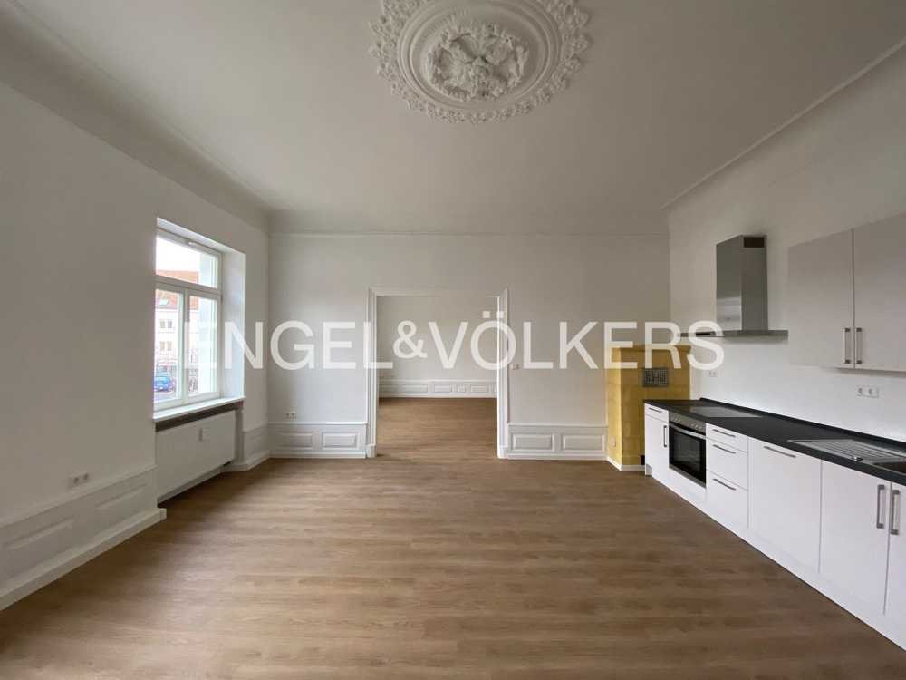 Diese hier angebotene Wohnung befindet sich der Beletage eines 2021 kernsanierten denkmalgeschützten Hauses direkt am Königsplatz. Sie verbindet klassisches mit zeitgemäßer Ausstattung. Hohe Decken mit kunstvollen Stuckverzierungen, stilvollen Kassettentüren und ein gepflegter Vinylboden schaffen eine einladende Wohnatmosphäre. Die lichtdurchfluteten Räume bieten durch ihre großzügigen Fenstern einen guten Blick auf den Marktplatz. Der offene Wohn- und Essbereich lädt zu geselligen Stunden ein, während die moderne Einbauküche funktionale Eleganz bietet.