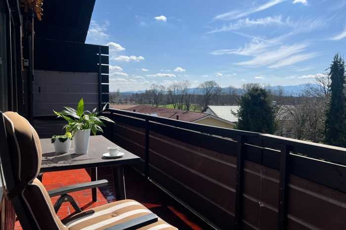 Der weite Blick in die nahen Berge, ist für sich allein schon ein high light. Die Raumaufteilung ist perfekt, das elegante Wohnzimmer mit Essplatz und durchgehender Fensterfront und direktem Zugang zum großen, tiefen Balkon, macht Laune in diese behagliche Wohnung einzuziehen. Schlaf- und Gästezimmer sind ausreichend groß. Ein neues, modernes, voll ausgestattetes Bad mit Wanne und Dusche, lässt keine Wünsche offen. Die Einrichtung ist fast komplett und kann selbstverständlich individuell ergänzt werden. Die Küche, funktionell und geschmackvoll, wird hohen Ansprüchen gerecht.