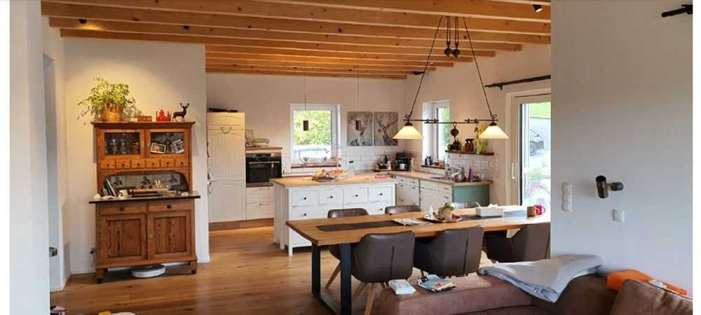 Der offen gestaltete Küchen-, Ess- und Wohnbereich verfügt über 2 Zugänge zu Garten und großer Terrasse sowie einer der Küche angrenzenden Abstellkammer.
