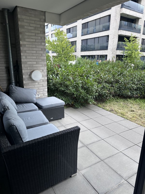 • große Terrasse mit eigener Rasenfläche – perfekt zum Entspannen oder für kleine Gartenideen