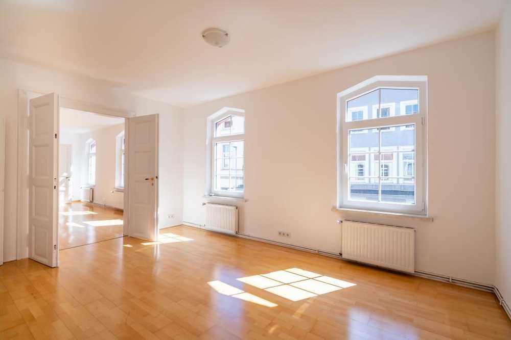 Die vorderen drei Zimmer zur Straße erzeugen mit den beiden Doppelflügeltüren eine angenehme Atmosphäre. Durch die Ausrichtung der Fenster gen Süden können Sie zudem auf künstliches Licht verzichten. Der Parkettboden wurde kürzlich abgeschliffen und erstrahlt im neuen Glanz.