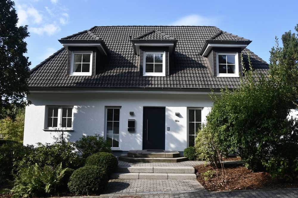 Auf der Eingangsseite des Hauses befindet sich die große Doppelgarage mit direkten Zugang zur Küche. Es sind ebenfalls noch zwei weitere Stellplätze vor der Garage vorhanden.