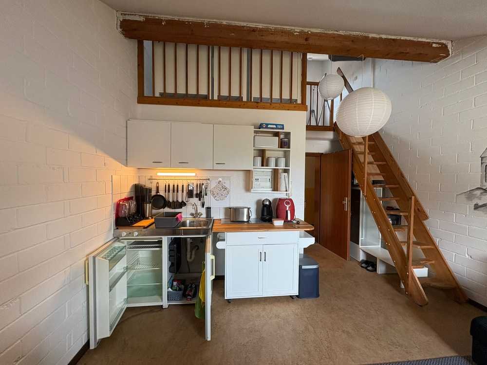 Die angebotene Wohnung ist eine charmante 1,5-Zimmer-Maisonettewohnung im Dachgeschoss eines Mehrfamilienhauses. Sie erstreckt sich über zwei Ebenen und bietet eine gemütliche Wohnatmosphäre durch die offenen Sichtbalken und die Dachschrägen.