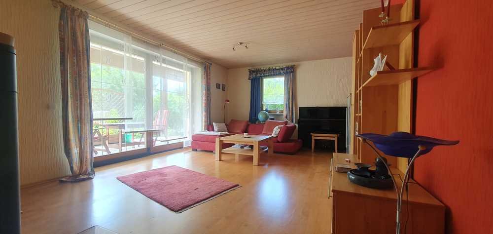 Ein besonderes Highlight ist die große, überdachte Terrasse, die gemeinsam mit dem weitläufigen Garten viel Platz zum Entspannen und Genießen bietet. Zur Wohnung gehören außerdem ein Garagenstellplatz und ein Kelleranteil.