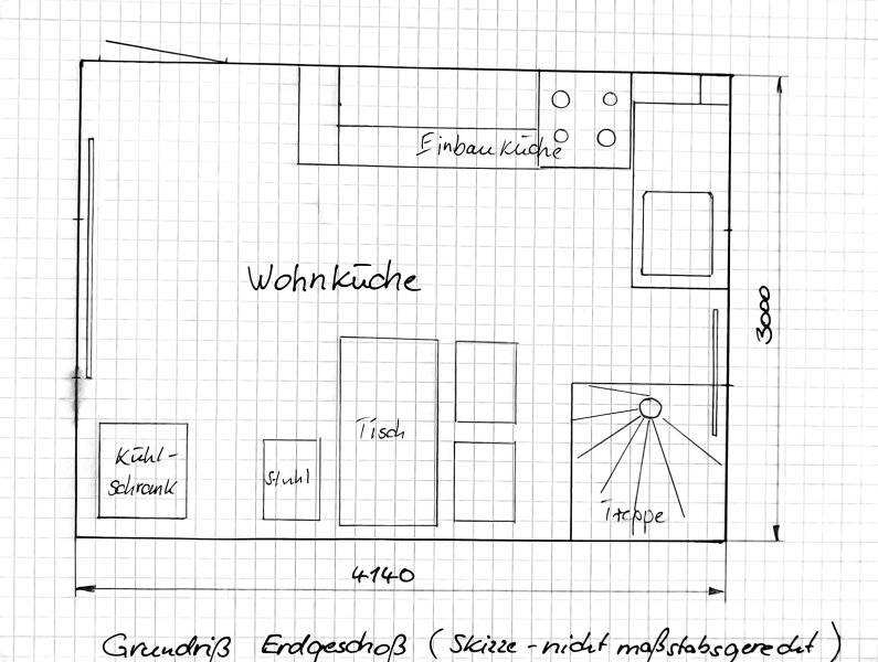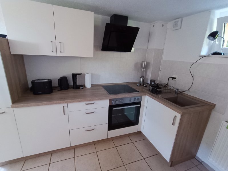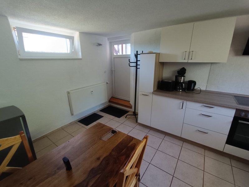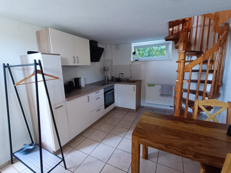 EG: Wohnküche mit Einbauküche (Vollausstattung), Dunstabzugshaube und Spüle/E-Boiler; Kühlschrank, Tisch mit 4 Stühlen, Kleiderständer.
